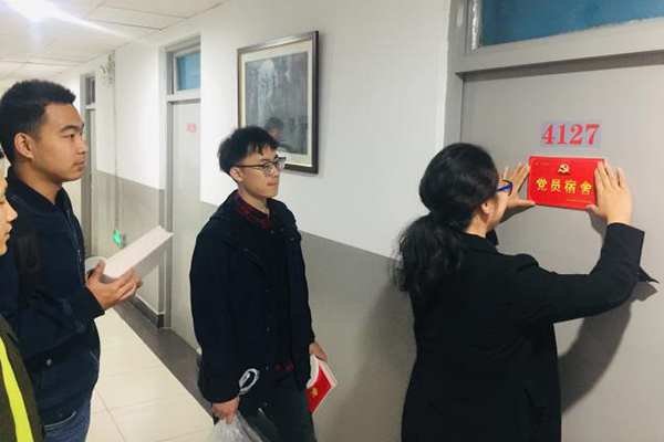 10月中下旬,学院开展了“教师党员先锋岗”和“学生党员宿舍挂牌”活动。学院为每名教师党员制作了刻有名字的“党员先锋岗”的摆台,在党建活动室张贴党员承诺墙,提醒党员教师时刻牢记身份,主动接受监督,树立良好的工作形象,践行立德树人的初心和使命。10月17日,学院在东校园汇才公寓四号楼举行了学生“党员宿舍”挂牌仪式,为14个学生党支部发放了学院统一制作的“党员宿舍”标牌,并为2019级研究生党员宿舍挂牌。