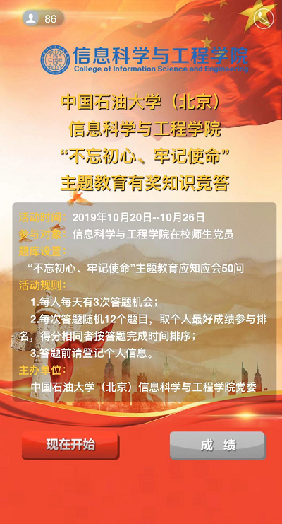 10月20日至26日,学院面向全体党员开展了“不忘初心、牢记使命”主题教育网络知识竞赛,在学院师生党员中间掀起了学习答题热潮。网络知识竞赛仿照“学习强国”学习平台中“每日答题”形式,采用微信答题的方式,以学校印发的《“不忘初心、牢记使命”应知应会50问》为题库,每人每天三次答题机会,并以答题分数和答题时间进行排名。活动期间,400余人次参与答题。通过比赛,师生党员进一步学习和掌握了主题教育相关知识。