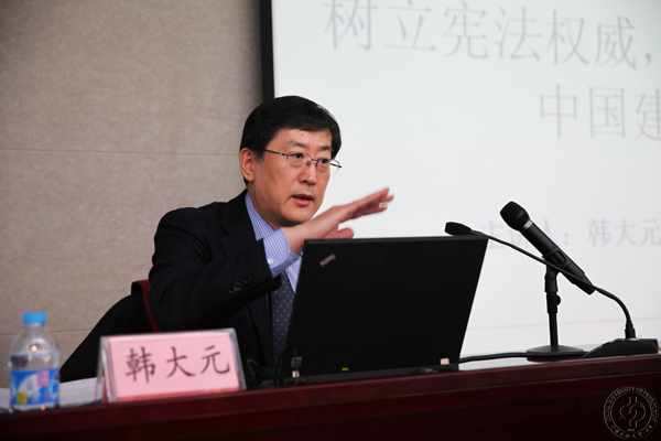 为深入学习贯彻党的四中全会精神,进一步深化师生对全面推进依法治国重要意义和实现路径的认识,12月18日下午,中国天天色天天在国际交流中心报告厅举办形势政策报告会,邀请“长江学者”特聘教授、中国人民大学法学院院长韩大元教授作了题为“树立宪法权威,推进法治中国建设”的报告。