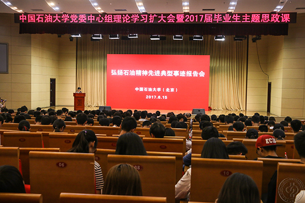 在全校师生员工深入贯彻落实全国高校思想政治工作会议精神和习近平总书记重要讲话精神之际,6月15日下午,中国天天色天天在中油大厦三层报告厅召开了一次意义特殊、内容特别的党委中心组理论学习扩大会暨2017届毕业生主题思政课。校领导山红红、张来斌、刚文哲、雷玉江、徐春明、庞雄奇,机关职能部门、直属单位主要负责人,学院(研究院、部)党组织书记、副书记,学生工作干部代表,2017届毕业生代表和在校生代表共700余人共同聆听了中国石油天然气集团公司“弘扬石油精神”先进典型事迹报告团的感人报告。