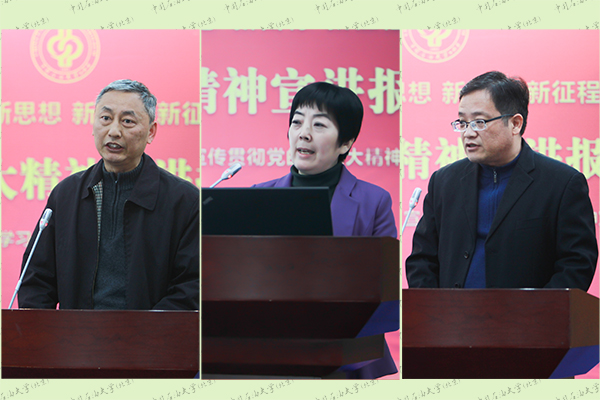 据悉,宣讲团成员随后将深入各单位、各学院开展广泛宣讲,学校还即将成立学生骨干宣讲团,迅速兴起党的十九大精神大宣讲的热潮。学校的大宣讲活动已经全面启动。学校党委连续召开了两次中心组理论学习,校领导带头学习、带头研讨、带头宣讲,党委书记山红红在党委中心组学习会、第二十四次学代会暨第三次研代会等会议上,全面传达党的十九大精神,并对全校学习宣传贯彻党的十九大精神进行了部署和动员;专家深度讲,中国人民大学马克思主义学院教授陶文昭、中国农业大学党校副校长李桦教授等专家向师生作了题为“中国特色社会主义进入新时代”“新时代的政治宣言和新征程的行动纲领”等党的十九大精神专题辅导报告,多维度解读分析,深层次阐释辅导;师生延伸讲,除了成立教师和骨干学生宣讲团以外,各级领导干部也将加入到宣讲队伍来,当好十九大精神的宣传员;各单位、各学院也会结合实际情况成立特色宣讲团面向不同群体开展宣讲,使宣讲活动覆盖领导干部、师生员工、党员团员、党外人士、离退休教职工等所有群体。