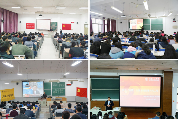 各院级单位党组织积极举办十九大精神主题辅导报告会,让十九大精神在师生中入脑入心。化学工程学院联合机械与储运工程学院等单位,理学院联合体育教学部分别邀请校外专家作了题为“不忘初心的新时代”、“新时代的政治宣言和新征程的行动纲领”的辅导报告。外国语学院、石油工程学院、地球物理与信息工程学院邀请学校学习宣传贯彻党的十九大精神宣讲团成员、马克思主义学院教师吴建伟、张冠军、杨晓锋分别作了题为“新时代 新目标 新征程——中国特色社会主义的最新战略蓝图”“新时代中国共产党的新使命、新工程——中共十九大报告解读”“法治中国在前行——十九大精神解读”的宣讲报告。科学技术研究院党委书记刘韵秋、党委副书记孙净宇面向入党积极分子分别作了题为“学习新党章,加强推进党的建设伟大工程”、“端正入党动机,明确入党目的”的专题讲座,将党的十九大精神和《中国共产党章程(修正案)》相关内容融入到课程中。
