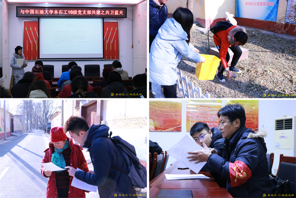 石油工程学院本石工16级党支部联合钟家营村村党支部开展学习十九大精神系列活动之“共卫蓝天”环保活动。活动中,学生党员将分类垃圾桶送至各家各户,为村民赠送环保宣传手册,向村民们宣传环保理念、引导和呼吁广大村民“低碳环保、绿色生活”。工商管理学院组织会计系、管理系经贸系教工党支部,工商研17-2、17-3学生党支部共38名党员先后观看话剧《韩文公》,感受主人公的爱国爱民情怀。