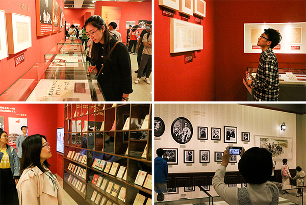 看到通过图片展现的马克思主义中国化的历史进程,理学院教师周广刚说:“从一百多年前苦苦探寻救亡图存之路,到如今日益繁荣富强,在中国争取民族独立、实现人民幸福的进程中,在中国特色社会主义的发展历程中,马克思主义永远闪烁着真理的光芒,彰显出其强大的实践指导力、深邃的理论穿透力、巨大的精神感召力。”工商管理学院辅导员杨昳晗说:“马克思的壮丽一生给我们留下宝贵的思想资源,我们要学习马克思身处困境、颠沛流离时不忘初心、顽强奋进的精神,学习习近平新时代中国特色社会主义思想,树立远大理想,积极拼搏进取,为实现中华民族伟大复兴的中国梦贡献力量!”看着一份份马克思原始手稿,化学工程学院学生揣云涵说:“隔着150多年的时光,这些手稿向我们传递出的正是马克思艰苦探索、追寻人类真理的精神。重温马克思主义一路走来的历程,我们在感受其真理光辉的同时,也获得了更多砥砺前行的动力。”在当代马克思主义美术作品前,地球物理与信息工程学院学生热阿宛·吾肯说:“看到艺术作品展现的革命先驱的光荣事迹,我们深刻认识到生长在中国共产党领导下的安定和平的中国是多么地幸运,我们应该珍惜这个伟大的时代,为早日实现中国梦而不懈奋斗。”