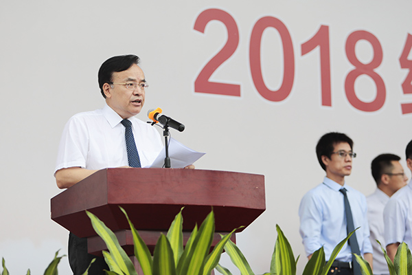 伴随着庄严的国歌声与冉冉升起的五星红旗,开学典礼正式开始。校长张来斌发表讲话,对石大新同学寄予殷殷希望。他代表学校欢迎石大基因的新传承人、代表新希望与新活力的石大新主人——2018级新同学如约而至,与石大一起共迎风雨,同赏晴空,希望他们接受石大精神的洗礼和文化的熏陶,在石大校园度过一段无悔的青春时光。