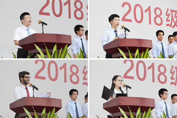 工商管理学院教授唐旭代表教师发言,鼓励同学们学会独立、敢于拼搏、懂得感恩,相信自己、相信石大,做一个有情怀的石大学子;化学工程学院2018级本科生施俊汐代表新生发言,他期盼能在石大美好的生活中,寻到属于自己的生活方式,拥有自己的精神信念,找准自己的人生定位;来自也门的学生莫森代表留学生新生发言,讲述了自己学习博大精深的汉语文化的经历,并以进入石大这个温暖的“大家庭”而感到骄傲与自豪;地球科学学院2017级硕士研究生王彤代表在校生发言,分享了自己的学习感悟并衷心祝愿同学们能在石大度过最美的青春时光!