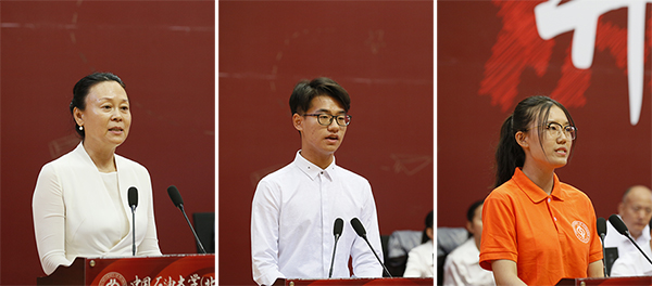文理学院王琳教授代表教师发言,希望同学们秉持石大精神,成就人生梦想,在美丽的红山湖畔收获如歌的青春岁月。石油学院资源勘查工程专业2017级本科生孙笑凡代表在校生发言,分享了学习感悟,衷心祝愿新生们能在石大度过最美的青春时光。工学院过程装备与控制工程专业2018级本科生朱泽勤代表新生发言,表示将用脚踏实地的付出和坚韧不拔的奋斗去诠释石大精神,成为一名名副其实的石大人。