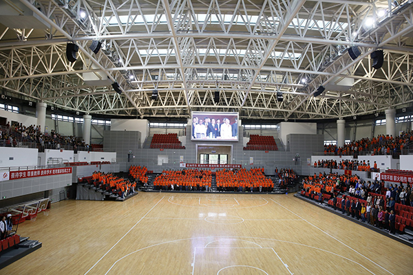 在这个特殊的日子,克拉玛依校区组织全校师生在体育馆集体观看大会直播。同襄盛举,共谱新章,共同祝福石大65周年华诞。