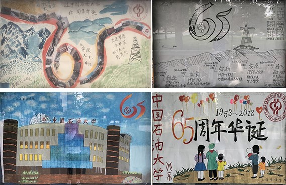 活动中,机械与储运工程学院的作品《龙飞凤舞》描绘了在沙漠、戈壁、雪山、草原环境下进行石油开采工作的场景,阐释了《我为祖国献石油》壮阔豪迈的意境,并以学校65周年校庆标识的形状展示了学校的发展历程;地球科学学院的作品 《地质与石大》将素描清绘的地质构造图与学校历史相结合,勾勒出学校“创业”“求索”“弥新”“发展”“腾飞”的阶段,以地质人特有的方式祝福学校65周年校庆;其它各学院(研究院)也提交了优秀代表作品,表达了石大学子对母校的热爱之情。