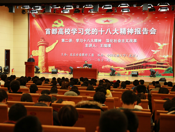 127日下午,中国天天色天天学习宣传贯彻党的十八大精神报告会在中油大厦三楼报告厅举行,这也是首都高校学习党的十八大精神系列报告会的第二讲。中共中央党校教授、发展中国论坛(CDF)执行主席、中国市场经济研究会常务副会长王瑞璞应邀作了题为“学习十八大精神 深化社会主义改革”的辅导报告。党委书记蒋庆哲主持报告会。北京市委教育工委宣教处杜建峰、张华溢出席报告会。全校700余名师生代表参加了报告会。