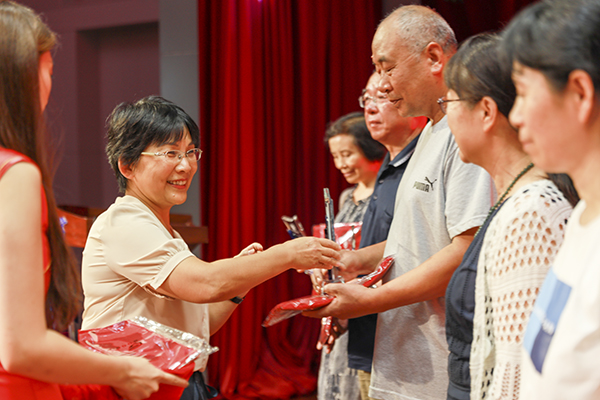 山红红为荣休教职工颁发了纪念奖杯,送上温暖的祝福。