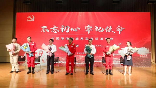 本次宣讲的先进典型包括全国海洋人物、渤海石油研究院地质总师牛成民,全国五一劳动奖章获得者、大榭石化工艺首席工程师兼生产技术部经理王以科,中央企业青年岗位能手、气电集团技术研发中心邰晓亮,全国劳动模范、海油工程安装事业部高级总监刘克建,全国民族团结进步模范个人、集团公司扶贫援藏干部王江涛,全国海洋石油工业先进集体临兴-神府项目指挥部,全国“工人先锋号”“南海二号”钻井平台,报告会还特别邀请了“海上铁人”郝振山到场与石大师生交流。