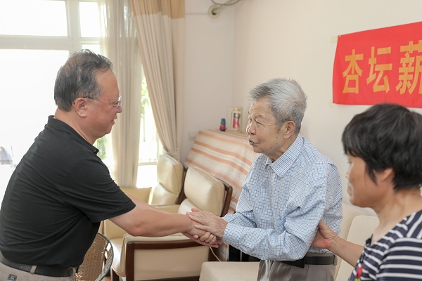 国庆节前夕,学校党委书记山红红、党委副书记雷玉江,为因身体不便未能参加学校纪念章颁发仪式的离退休老同志上门颁发纪念章,并代表学校对老同志进行慰问,送上节日的祝福。组织部、离退休工作处和有关学院负责人参加了慰问活动。