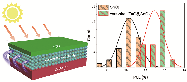 该研究成果首次提出了氧化锡包覆氧化锌核壳纳米结构的制备方法,揭示了其具有较高光电转换效率的内在机理。由于SnO2壳层的能级匹配和核层ZnO纳米粒子的高电子迁移率,无机钙钛矿太阳能电池的光电转换效率高达14.35%。ZnO@SnO2核-壳纳米粒子的尺寸为8.1nm,电子迁移率是SnO2纳米粒子的7倍。同时,均匀的核壳型ZnO@SnO2纳米粒子对无机钙钛矿薄膜的生长极为有利。这些结果表明,氧化锡包覆氧化锌核壳纳米结构是一种理想的太阳能电池的电子传输层,光电转换效率比传统的电子传输材料提高40%。