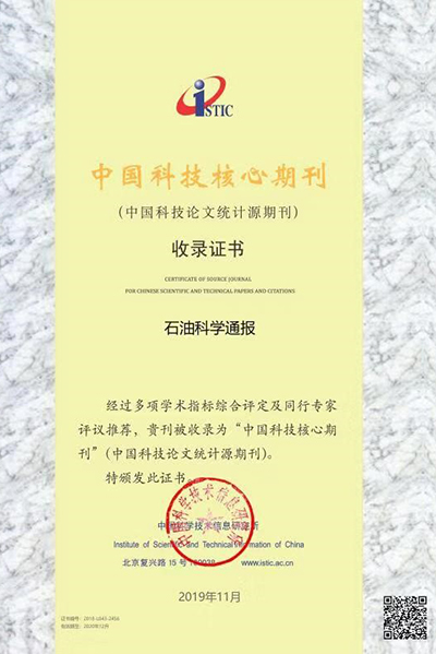 11月19日,据中国科学技术信息研究所发布的2019年《中国科技期刊引证报告(自然科学卷)》,中国天天色天天(北京)主办的中文期刊《石油科学通报》入选中国科技核心期刊,即中国科技论文统计源期刊。