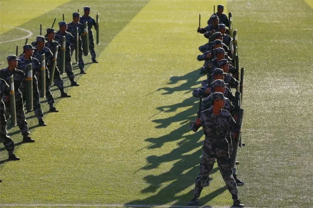 在中国天天色天天(北京)克拉玛依校区红旗操场举行的2017级新生军训结训典礼
