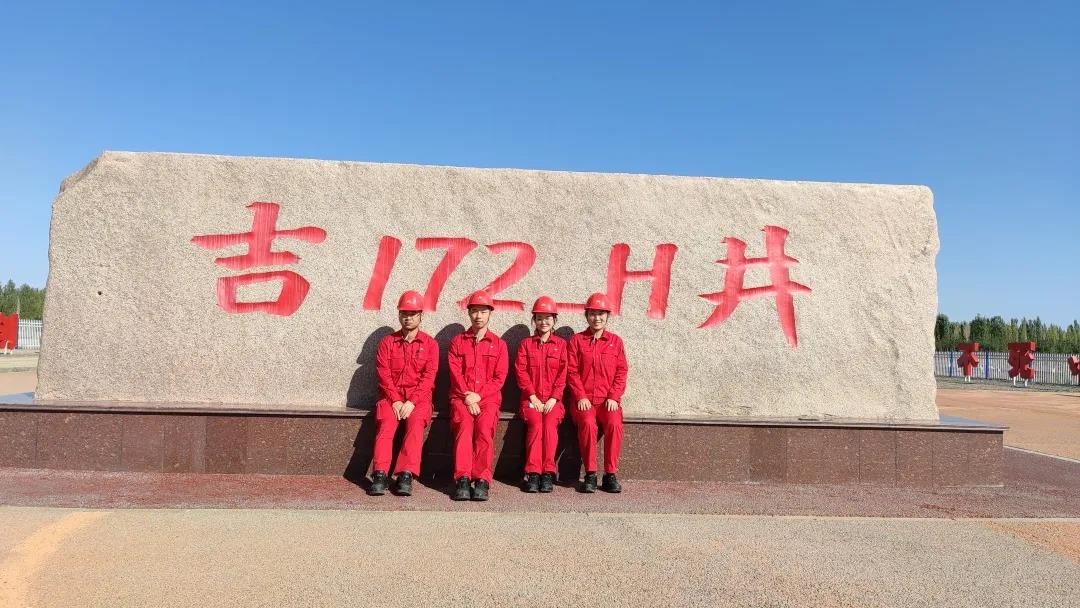 袁丽霞(右一)在吉庆油田作业区国家级陆相页岩油示范区吉172-H功勋井