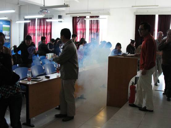 最后,为巩固培训效果和增强实效性,通过制造烟感,模拟火灾现场,即时考验了参加培训人员的逃生意识、初起火险应急处置能力,通过演练,参与培训人员基本能够做到:不慌不乱,第一时间安全有序的撤离火灾现场。