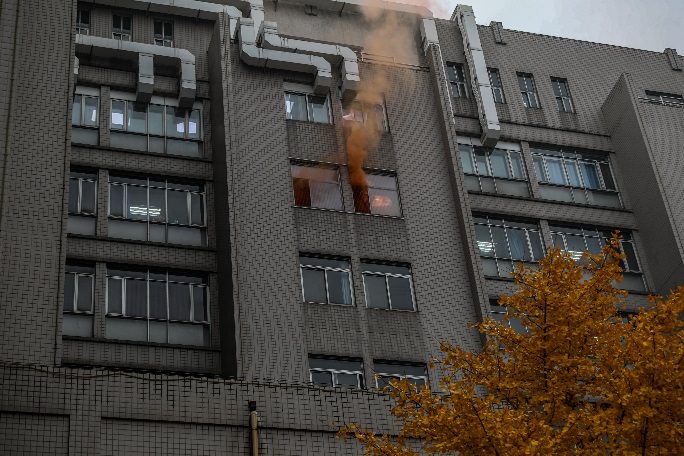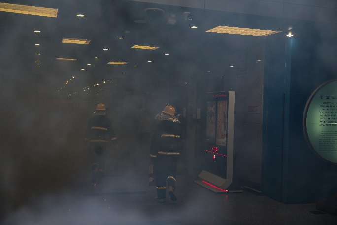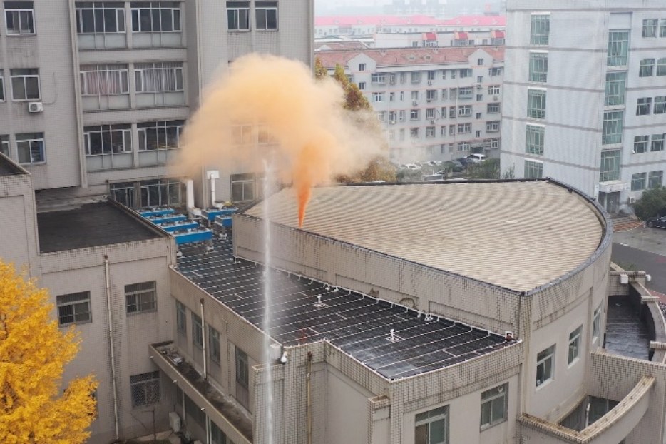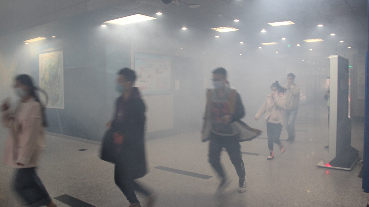 演练现场烟雾滚滚,触发感烟探测器报警,学校中控室接警确认火情后立即启动火灾应急处置预案,启动地质楼消防联动设备,疏散引导组立即打开地质楼所有疏散门,引导组织楼内师生疏散至安全区域集合。