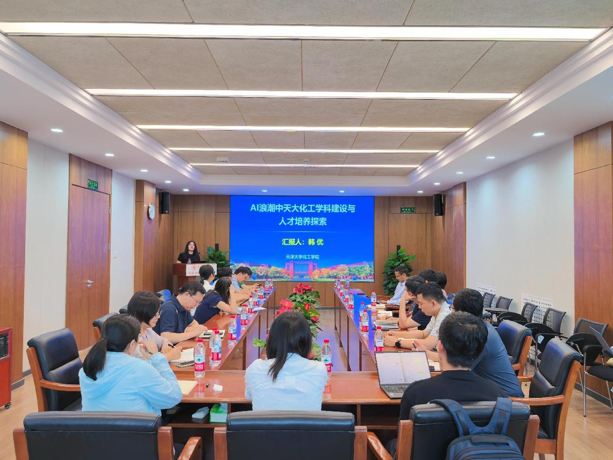 2025 年 6 月 13 日下午,天津大学化工学院副院长、国家级青年人才韩优教授应化学工程与环境学院邀请,于化工楼 B403 会议室作题为《AI 浪潮中天大化工学科建设与人才培养探索》的专题报告。学校教务处副处长宋健斐、重质油全国重点实验室常务副主任/碳中和未来技术学院执行院长蓝兴英、化工学院院长张香平、副院长姜桂元及朱文帅、专业负责人、系主任、教学团队负责人、教学专家组、AI 教改项目负责人等 30 余人参加报告会,会议由姜桂元副院长主持。
