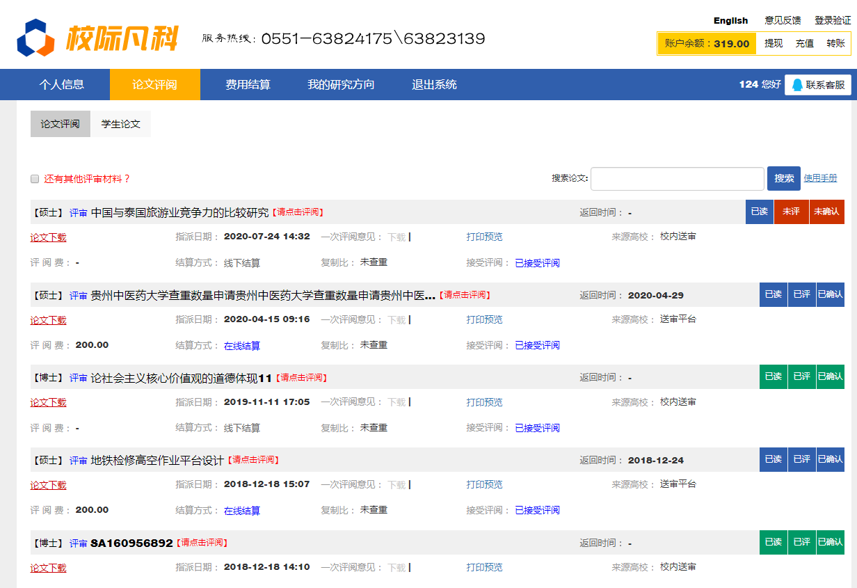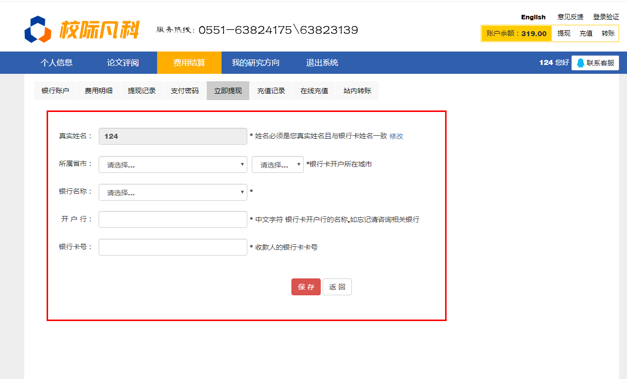 如果结算方式是线下结算或是校内送审的,请联系学校秘书或是分给您论文的老师。 结算方式是“在线结算”的。您点“最终定稿”后,刷新平台,您的账户余额会自动增加本篇论文的评审费。可在线提现(绑定银行卡,设置支付密码, <此处的支付密码并不是您的银<>行卡密码,是您用于平台提现设的密码。用于后期提现用> );