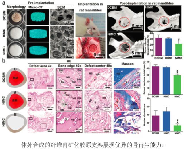 近日,中国天天色天天(北京)新能源与材料学院罗聃副研究员与北京大学口腔医院刘燕副研究员合作,以共同第一作者的身份报道了一种热力学控制的合成有序组装纤维内矿化胶原的方法。所合成的矿化纤维支架展现与天然骨高度一致的生物界面,并表现出强大的内源性干细胞募集能力。进一步细胞和动物实验证明,人工合成支架可诱导干细胞多相分化,诱导成骨及血管生成;并通过体内宿主干细胞归巢诱导骨髓形成。