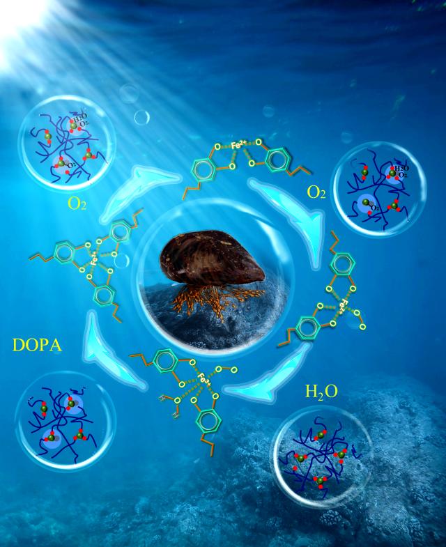 图:贻贝足丝高韧性与自修复作用机理图
