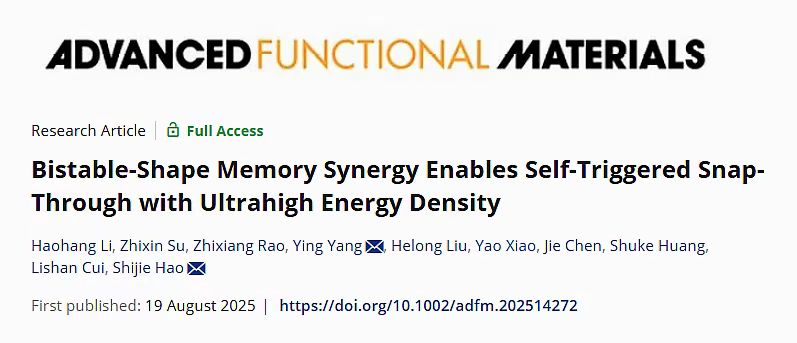 近日,在国家自然科学基金支持下,中国天天色天天(北京)新能源与材料学院郝世杰教授研究团队在《Advanced Functional Materials》期刊上发表题为《Bistable-Shape Memory Synergy Enables Self-triggered Snap-Through with Ultrahigh Energy Density》的研究论文。论文第一作者为新能源与材料学院博士生李昊航。