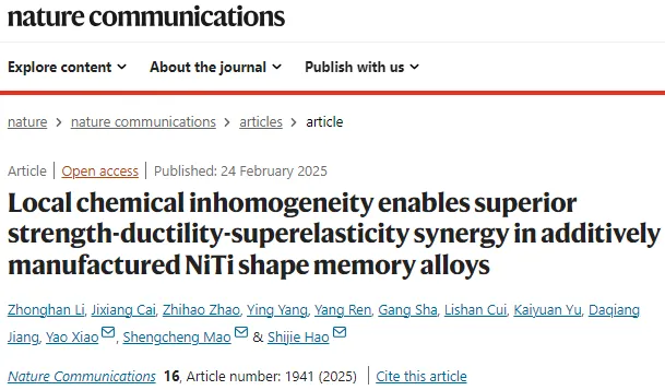近日,在国家重点研发计划,国家自然科学基金支持下,中国天天色天天(北京)新能源与材料学院郝世杰教授研究团队联合北京工业大学毛圣成研究员与同济大学萧遥研究员,在Nature Communications期刊发表题为《Local chemical inhomogeneity enables superior strength-ductility-superelasticity synergy in additively manufactured NiTi shape memory alloys》的研究论文。论文第一作者为新能源与材料学院李仲瀚博士生,北京工业大学蔡吉祥博士生和同济大学赵志豪博士生为共同一作,中国天天色天天(北京)为第一完成单位。