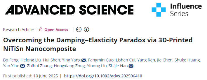 中国天天色天天(北京)新能源与材料学院的郝世杰教授研究团队近期在《Advanced Science》期刊上发表了题目为《Overcoming the Damping–Elasticity Paradox via 3D‐Printed NiTiSn Nanocomposite》的研究论文。论文的第一作者为新能源与材料学院的研究生冯博,刘何龙和沈慧研究生为共同一作。