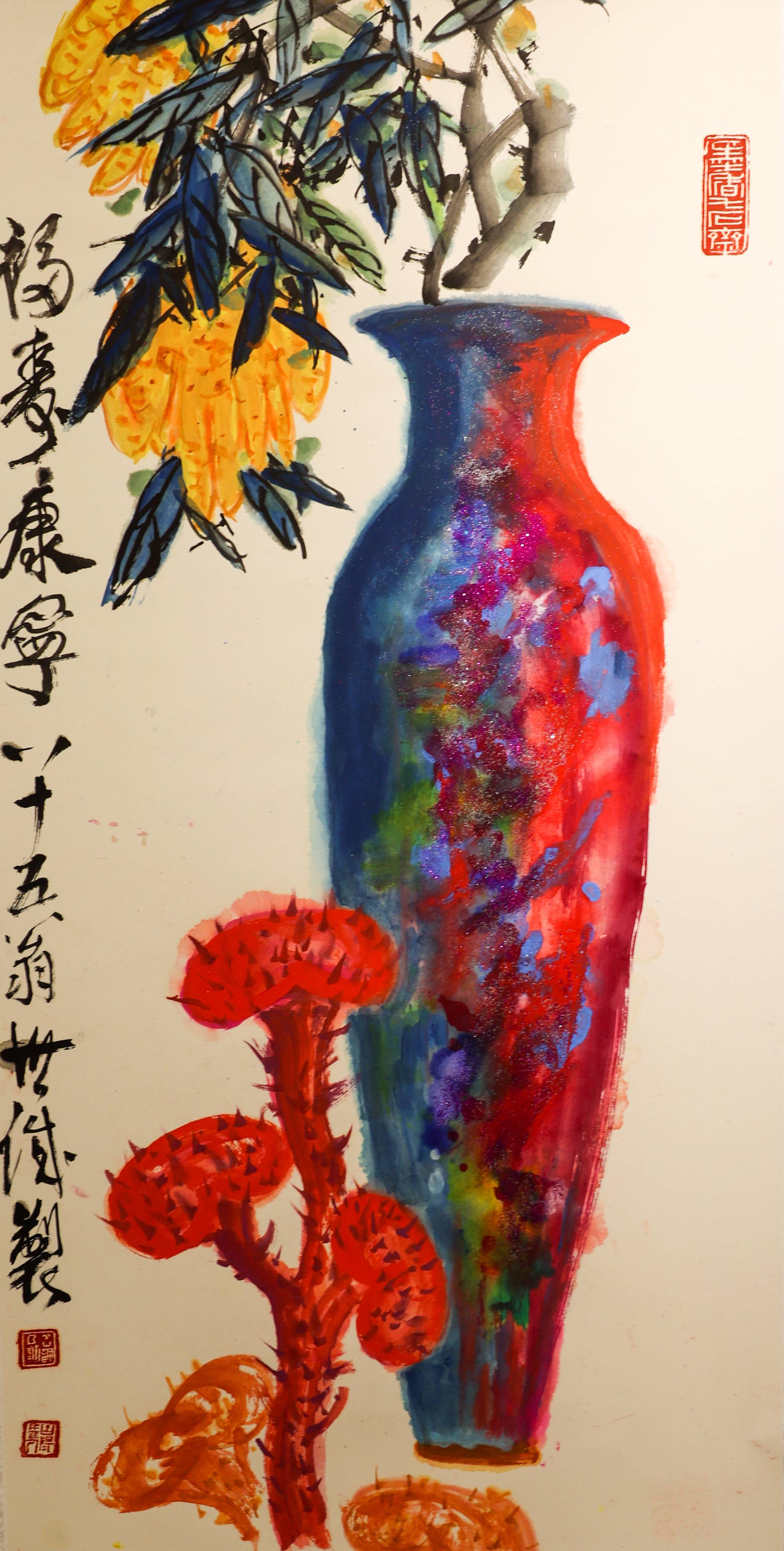 钧瓷是我国宋代五大名瓷之一,以“入窑一色,出炉万彩”为特点,余世诚以钧瓷窑变为创作之源,坚持重彩大写意的创作理念,以国画形式和传统技法来表现钧瓷窑变之美和钧器之美,既开启了中国画的新意境,又增加了钧瓷艺术欣赏和钧瓷文化新内容。