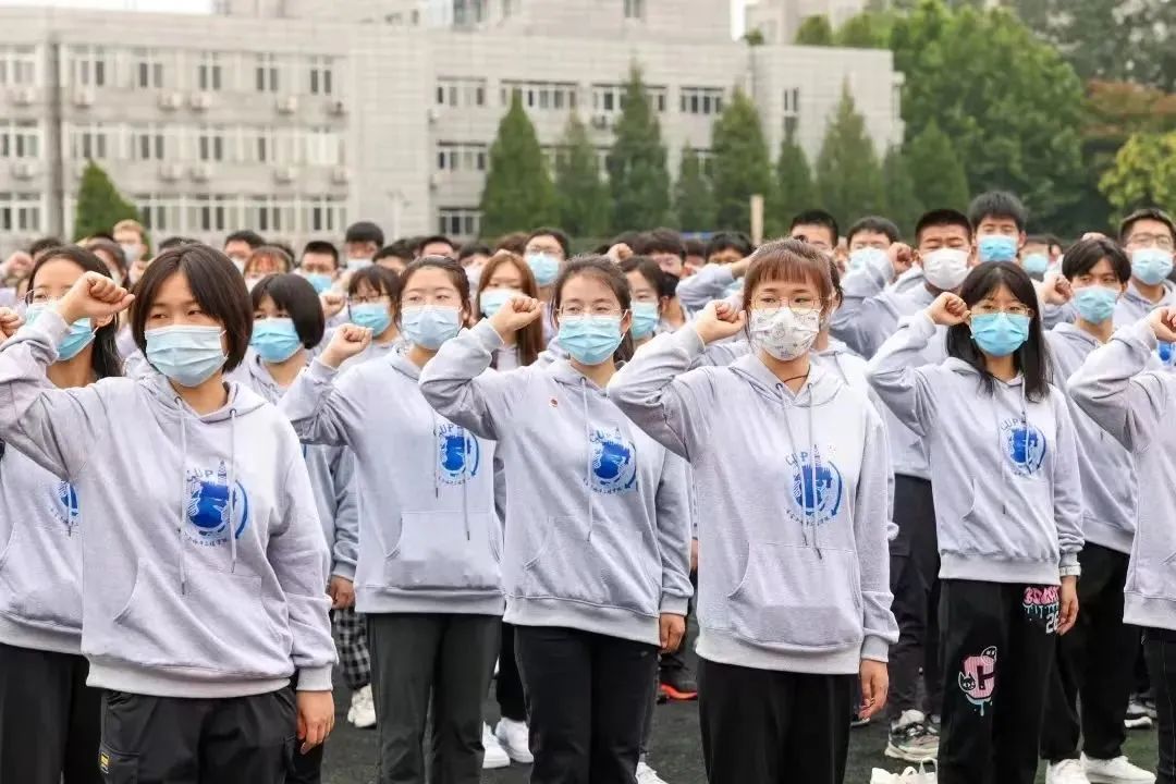 在克拉玛依校区的红旗操场上新生认真参加入学军训