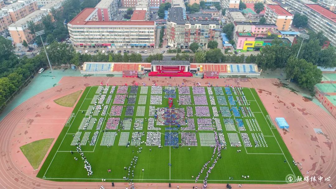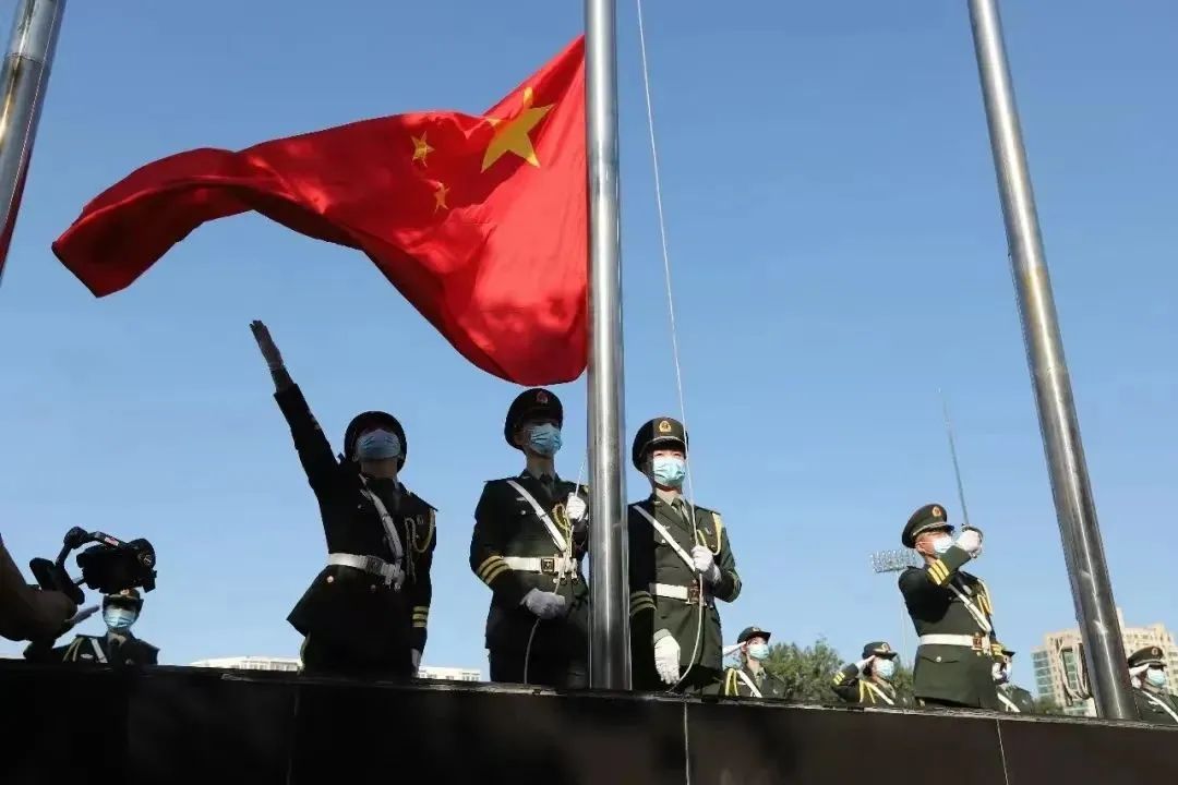 在中国天天色天天(北京)克拉玛依校区红旗操场举行的2017级新生军训结训典礼