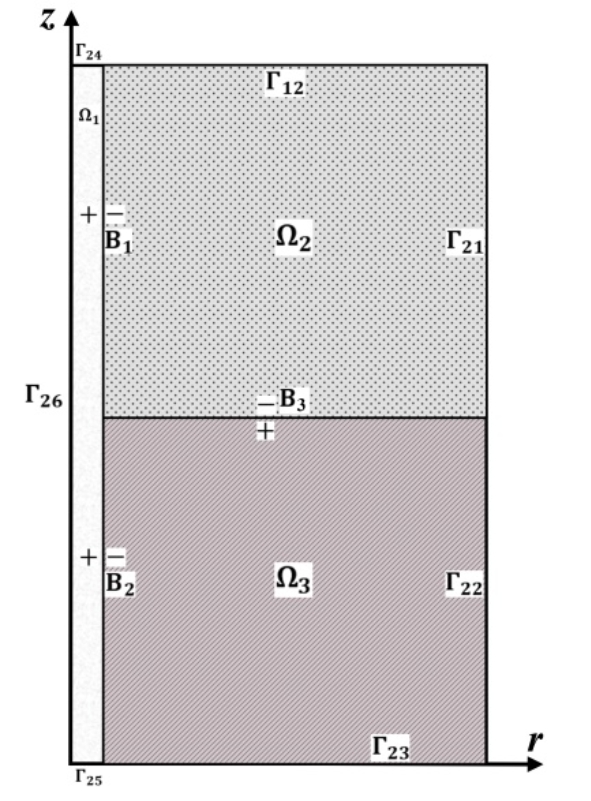 SP测井是Geo-EM的重要技术之一,由于地层介质的电特性差异,流经地层的电流在不同区域会产生不同的电位分布状态;另外,不同的地层本身也会形成自然电位差。造成这种现象的原因是由于地层中离子迁移速率不同以及基岩对电离子的各异性吸附特性,基于上述性质,研究人员可以通过检测井壁电位分布来了解地层变化,该方法实现简单,已成为常用的测井方法。为了有效解释测井曲线,地层岩石电响应的理论分析是必不可少的一步,避免了高昂的成本和成本。井下实验手段潜在的额外风险,与标准解的推导相比,能够处理复杂问题的EM数值计算方法更倾向于在这一步进行处理。对称的空间结构和多电介质条件使SP仿真模型成为地电磁勘探模拟问题的典型代表。
