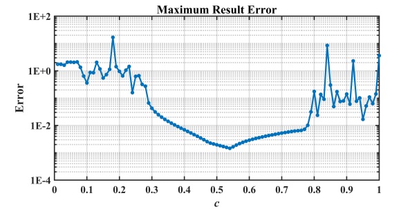 此外,我们将OC-RPIM算法的计算结果与目前常用的形状参数c选择准则下的无网格方法进行了比较,通过对比发现,该算法始终可以c的数值稳定在合理范围内,而常用的c选择准则非常容易失效。