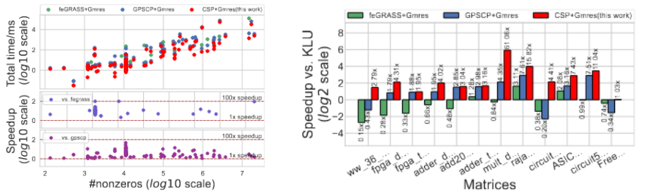 图4:(a)CSP算法相对SOTA方法加速比;(b)预条件迭代求解相对KLU求解加速比