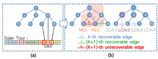 当考虑添加树外边时,我们需要标记生成树上树其他树外边。然而,在新添加的边和其他非树边之间建立连接会带来挑战。在本文中,为了提高效率,我们创建了一个以节点和为起点的互斥区域,作用于边,这样就可以跳过具有由同一边标记的互斥端点的离树外部,如图3(b)所示。最后,为了减少内存和时间开销,我们将LCA作为一个集合对边进行分组。