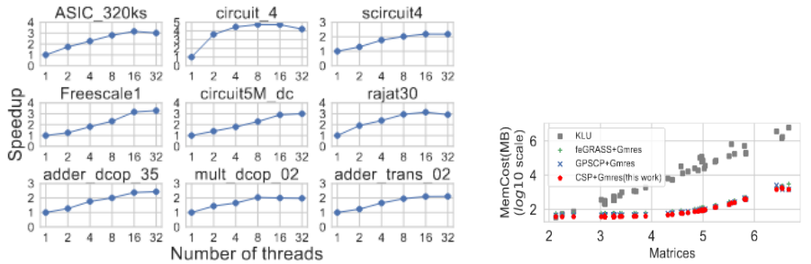 我们对不同大小和非对称边占比的矩阵进行了测试,实验结果表明与最先进的GPSCP、feGRASS等谱图稀疏化算法生成的预条件子+GMRES迭代法解法器,以及直接法解法器KLU相比,使用CSP算法求解非线性电路矩阵时,串行平均加速比分别为2.50x、13.46x、2.18x。