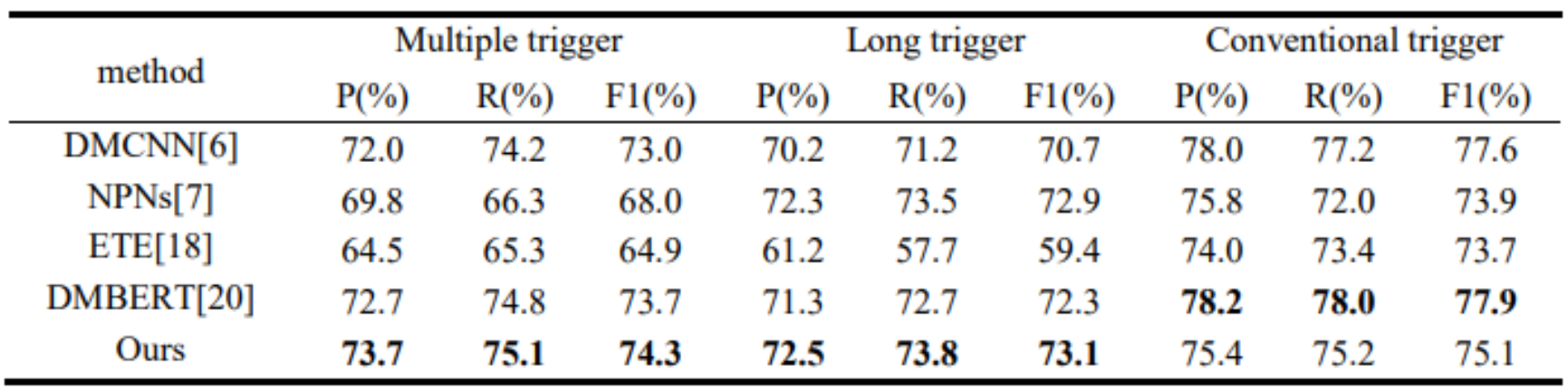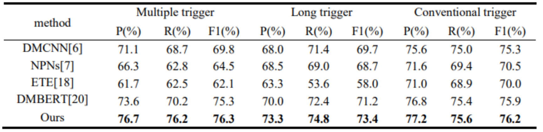 表1和表2显示,本文提出的触发词抽取算法在EEPCD数据集和ACE 2005数据集上都表现良好。这是由于本文提出的抽取算法考虑了长触发词和多触发词的现象,对包含长触发词和多触发词的事件句进行了详细的分析和理解,同时利用依存句法分析工具来更好地捕捉触发词之间的关系,并最大限度地减少它们的遗漏。