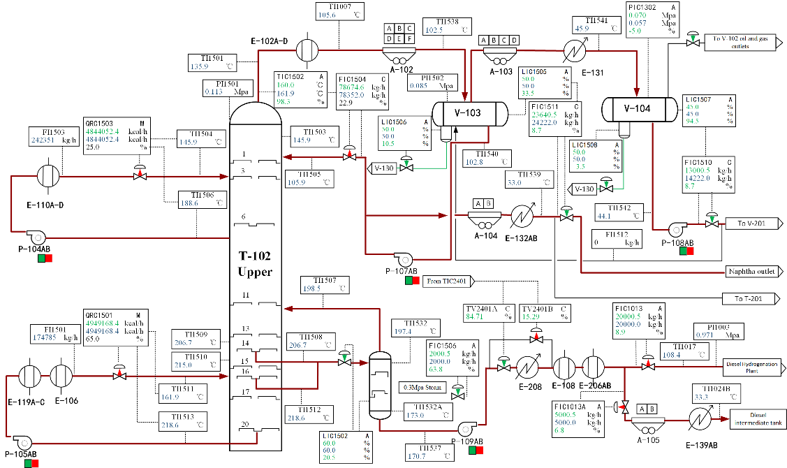 本文在中国天天色天天炼油与自动化模拟实习基地进行的工业实验。本文利用UniSim仿真系统对500万吨常压和真空蒸馏装置进行了模拟,如图2所示