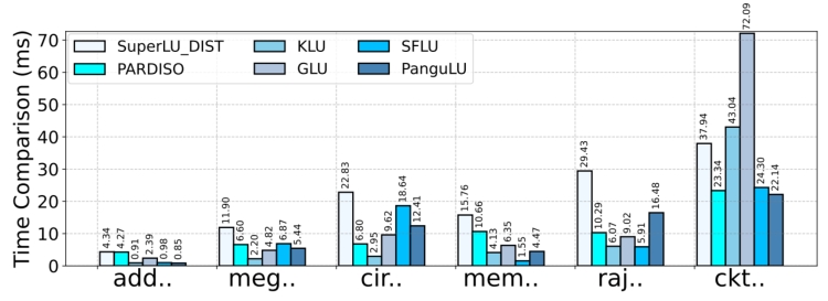 表1展示了几种稀疏直接法解法器并在图5中对其数值分解的性能进行了对比。当矩阵规模、矩阵列之间的依赖关系、计算平台不同时,这些求解器的性能优劣关系都会产生变化。因此结合矩阵特征并充分利用计算平台来进一步优化LU分解是一个巨大的挑战。