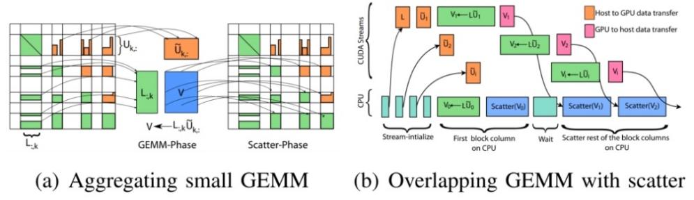 在利用GPU加速计算内核方面,Piyush Sao等人开发了一种将小型密集BLAS操作聚合为一个较大操作的策略(如图3)。Xu Fu等人在其开发的求解器PanguLU中使用规则的2D分块策略,将其与决策树相结合后将部分内核放在GPU上实现相对加速。然而,结合矩阵特征来实现进一步的加速仍然具有挑战性。