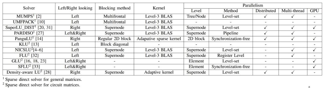 在利用分布式异构平台进行加速方面,Patrick R. Amestoy等人开发的求解器MUMPS利用异步通信和动态任务调度在Multifrontal方法中进行加速。Xu Fu等人在异构分布式平台上提出的PanguLU利用多种分块稀疏BLAS方法来提高GPU的效率、利用无同步通信策略降低总体延迟成本。