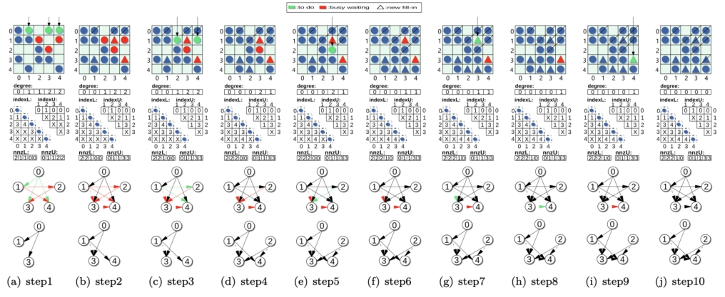 在利用GPU加速任务调度方面,Jianqi Zhao等人在GPU上提出SFLU利用无同步通信策略来充分利用GPU资源(如图4)。但当矩阵尺寸较小或列之间存在较强依赖性时,如何有效地将计算和调度策略结合起来,充分利用GPU的算力仍然是一个具有挑战性的问题。