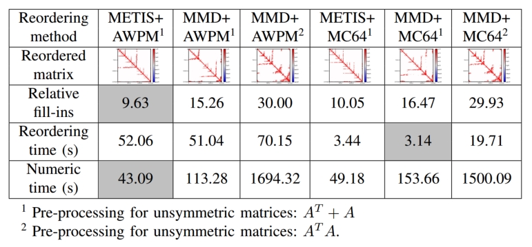 在稀疏LU分解的预处理阶段采用不同的行列重排序方法会对性能有不同的影响(如图1)。对此,Ganqu Cui等人结合支持向量机和神经网络提出了一种基于AI来分析并选择最佳重排序方案的算法。但目前所有现有的基于AI的策略通常都是从现有方法中的选择最佳替代方案。利用半监督或无监督学习为矩阵生成特定的最优重排序方法在未来是非常有前途的方向。