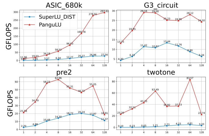 我们进一步对比了在32节点128GPU分布式集群上SuperLU_DIST和PanguLU(如图6)。虽然分布式方法具有并行加速的潜力,但由此产生的开销仍不可忽略,利用具有异构处理器的大规模超级计算机提高可扩展性以及降低具有不规则稀疏结构依赖性的进程之间的同步和通信成本仍然是一个巨大的挑战。