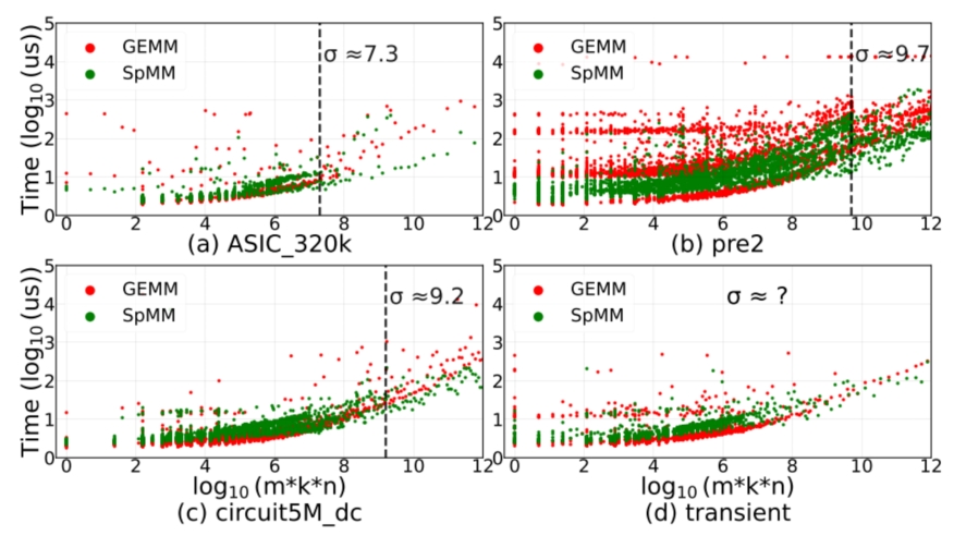 在稀疏LU分解的数值分解阶段采用不同类型的矩阵乘法也会产生不同的性能(如图2)。TengCheng Wang提出了一种配备随机森林的密度感知自适应矩阵乘法以对不同的子矩阵块选择性能最优的矩阵乘法,来加速稀疏LU分解。