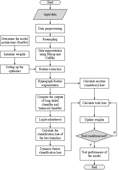 针对这些问题,我们提出了一种基于超图特征增强和自适应逻辑调整的长尾双分支模型。超图特征增强策略优化潜在特征表示,逻辑调整函数自动校准模型置信度偏差。我们的HALR同时改进了解耦长尾学习的表征学习和分类器学习任务。此外,我们采用余弦相似度度量学习方法来约束全局和局部混合一致性。在四个基准数据集的大量实验证实了我们提出的模型的有效性。