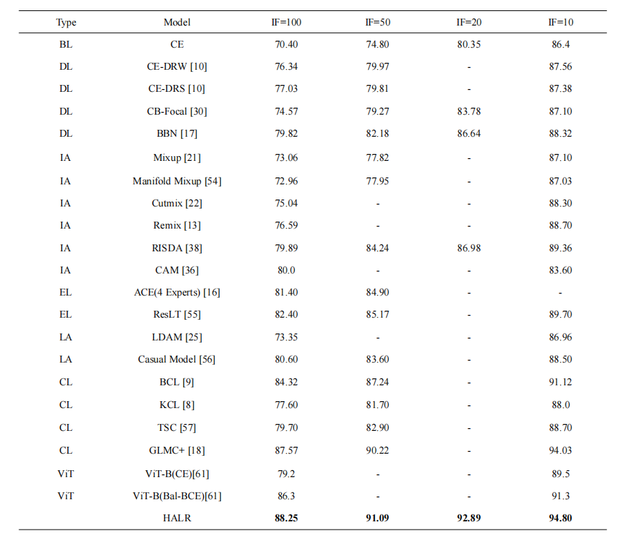 我们在四个广泛使用的长尾数据集上评估了我们提出的HALR的性能:CIFAR10-LT, CIFAR100-LT, ImageNet-LT和iNaturalist2018。