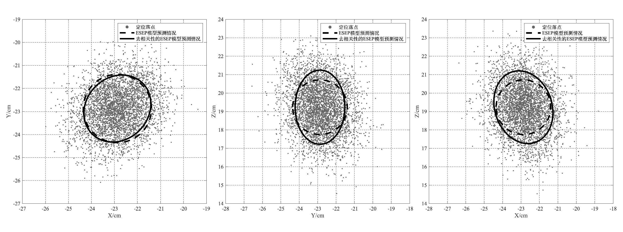 为了验证数学模型程序的预测效果,本节对坐标为(420,420,60)的标签在理想情况下模拟生成3000个定位落点,再使用ESEP模型和去相关性的ESEP模型预测标签的定位落点信息,如图1所示。可以观察到去相关的ESEP模型不受三坐标轴方向的限制,在三视图中与实际落点的整体倾斜趋势一致,在模拟中的预测区域更接近于落点分布形状,从而更好地概述了定位系统的精度。